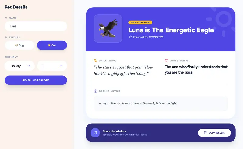 Ever wondered what kind of day your pet is having in their own little universe? The Pet Horoscope & Daily Forecast adds a playful twist to pet parenting by revealing your pet’s personality archetype, daily energy, and fun cosmic insights based on their name, species, and birthday.